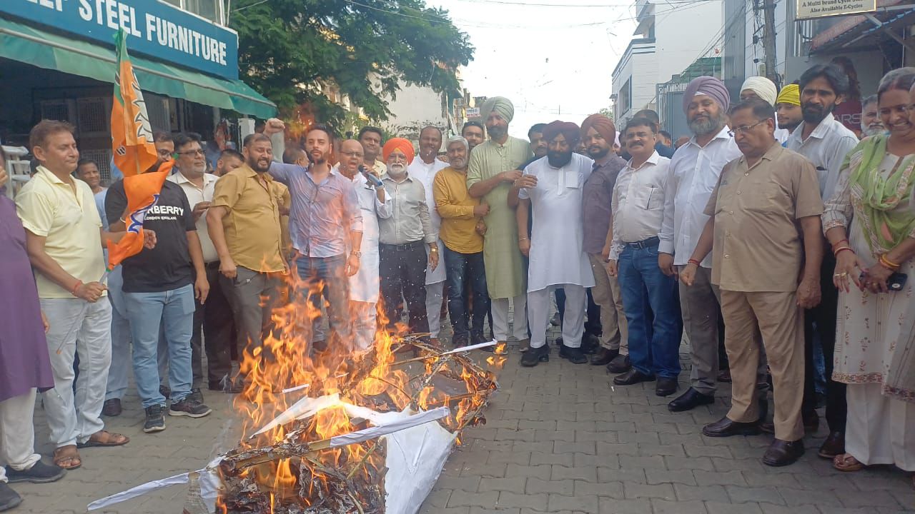 जालंधर ( विजय अटवाल ) : भारतीय जनता पार्टी जालंधर शहरी द्वारा प्रदेश भाजपा कार्यकारी अध्यक्ष अश्विनी शर्मा के आह्वान पर भाजपा जिलाध्यक्ष सुशील शर्मा की अध्यक्षता में शहर के चारों विधानसभा हल्कों में मान सरकार की धक्केशाही और पूर्व सांसद सुशील कुमार रिंकू एवं पूर्व संसदीय सचिव भाजपा प्रदेश उपाध्यक्ष कृष्ण देव भंडारी पर पंजाब पुलिस द्वारा पक्षपात रवैया अपनाते हुए मान सरकार के दबाव में जो उनकी गिरफ्तारी की उसके खिलाफ पूतला फूंक प्रदर्शन किया गया।इसमें जालंधर सेंट्रल में भाजपा प्रदेश महामंत्री राकेश राठौर के नेतृत्व में श्री राम चौक में, नॉर्थ हल्के में भाजपा जिलाध्यक्ष सुशील शर्मा के नेतृत्व में किशनपुरा,कैंट हल्के में पूर्व विधायक सरबजीत सिंह मक्कड़ के नेतृत्व में सब्जी मंडी चौक,वेस्ट हल्के में पूर्व विधायक शीतल अंगुराल के नेतृत्व में बाबू जगजीवन राम चौक में धरना प्रदर्शन किया गया।